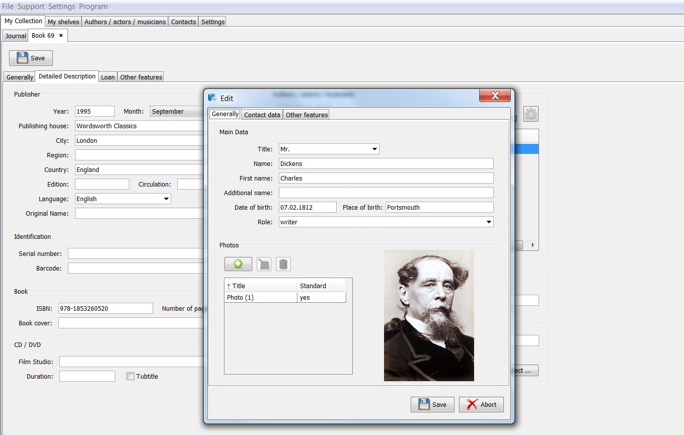 The program offers you an easy way to manage your books, CDs and other objects. Your articles can be individually aligned to a category and subcategory. There are already pre-defined categories by default, and it is also possible to add your own categories. For each item, you can enter numerous features, such as: publisher, ISBN-code for a book or format and duration for a CD. In addition, you define your own desired characteristics. The Program allows filtering of the managed objects by the entered values. Each object can also have unlimited number of images.