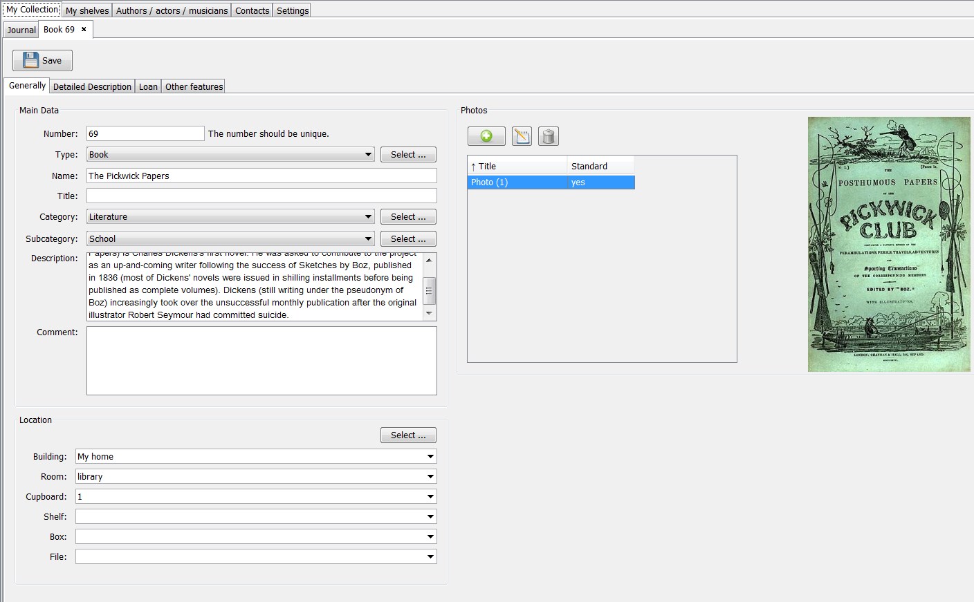 Another useful function of the program is the management of “shelves”. Each item can be placed in a certain building, room, box and such. So, you can get a complete review where to find the managed objects.