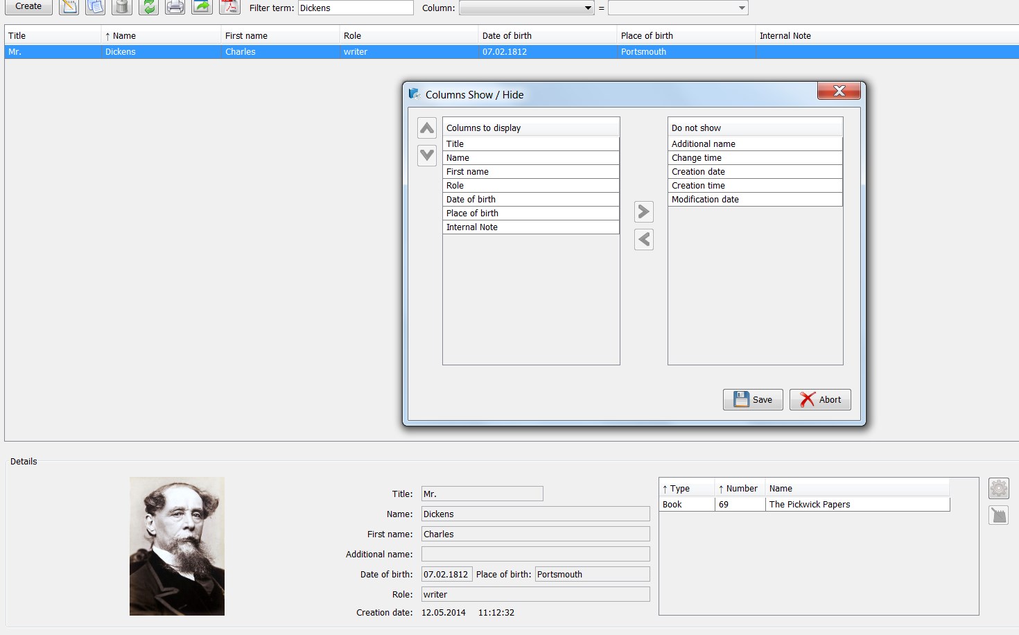 Furthermore, the object can be assigned to several persons with a certain “role”. Role in this case means, for example, author, lead singer of a CD or user data. Moreover, for each person may be added a detailed description, such as the name, date of birth and photos.