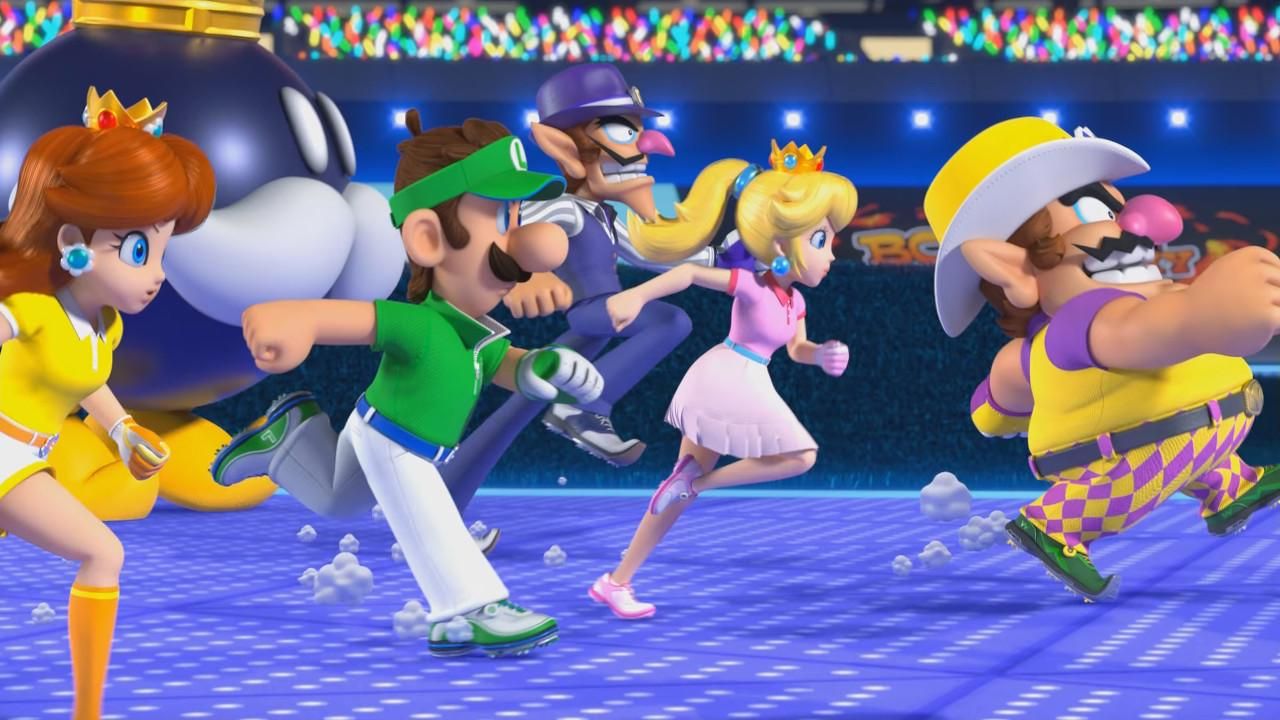 Tee off at the same time with up to three other players* and race through the course to get your ball in first. Mayhem is par for the course as you hinder your opponents with dashes and Special Shots. Yoshi can dash atop a giant egg and King Bob-omb can pelt the green with explosions! In Battle Golf, watch out for obstacles like Thwomps, Chain Chomps, and banana peels as you navigate the neon-themed Super Golf Stadium.